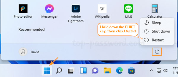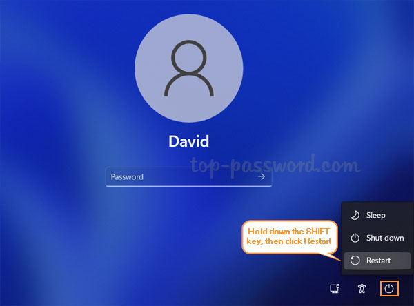 On the Windows 11 sign-in screen, press and hold the Shift key while you click the Power icon in the lower right corner and select Restart.