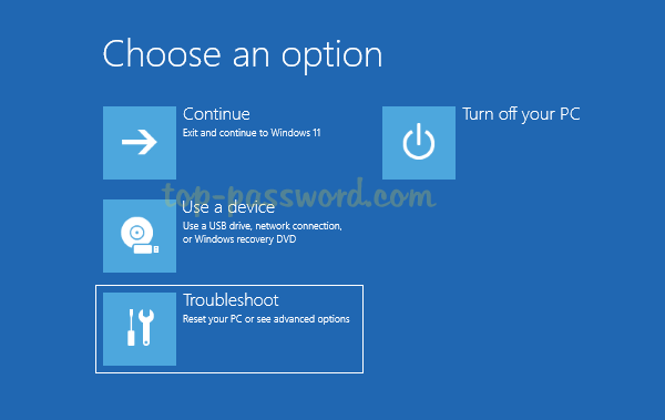 When you get to the "Choose an option" screen, click on Troubleshoot.