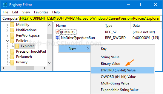 HKEY_CURRENT_USER\Software\Microsoft\Windows\CurrentVersion\Policies\Explorer. Right-click the Explorer key and select New -> DWORD (32-bit) Value.