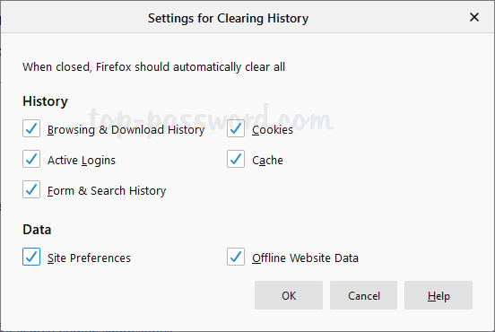4. Choose what you want Firefox to automatically clear on exit, and click OK.