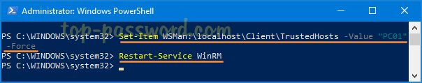 Set-Item WSMan:\localhost\Client\TrustedHosts -Value "PC01" -Force