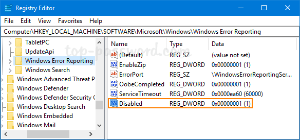 2. Name the new DWORD “Disabled“, and set its value data to 1. If you need to turn on problem reporting later, just change the value to 0.