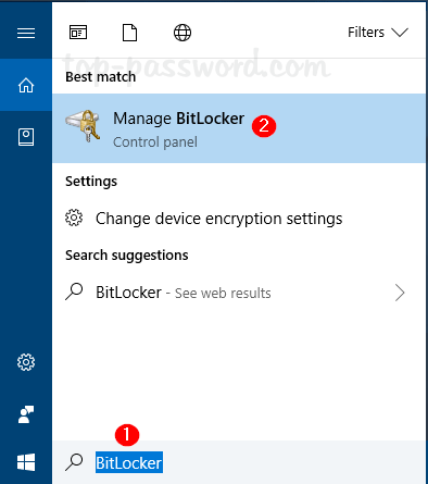 1. To start, type BitLocker in the Cortana search box on the taskbar, and then click Manage BitLocker from the result to open the BitLocker Drive Encryption control panel.