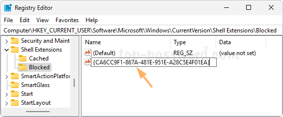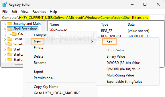 HKEY_CURRENT_USER\Software\Microsoft\Windows\CurrentVersion\Shell Extensions. Right-click the “Shell Extensions” key and choose New -> Key.