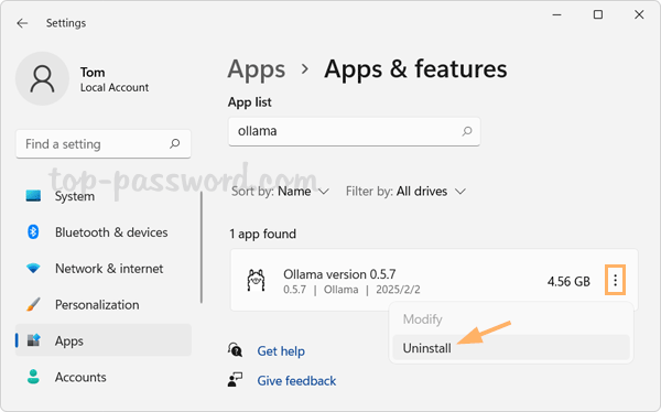 ollama in the search box to locate the Ollama app.