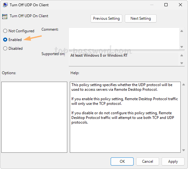 Computer Configuration -> Administrative Templates -> Windows Components -> Remote Desktop Services -> Remote Desktop Connection Client. On the right pane, double-click the “Turn Off UDP On Client” policy.
