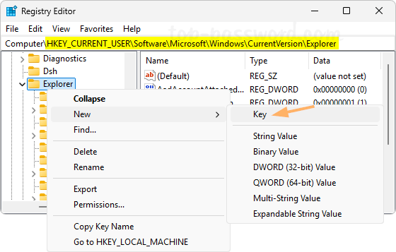 HKEY_CURRENT_USER\Software\Microsoft\Windows\CurrentVersion\Explorer. Right-click the Explorer key on the left-side panel, and choose New -> Key.