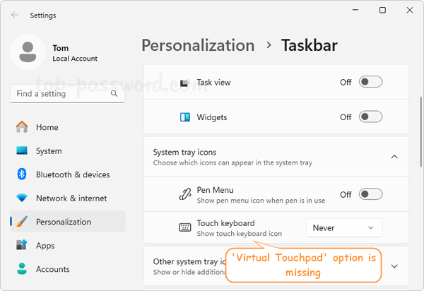 Usually we can turn virtual touchpad on or off via opening the Settings app and browsing to Personalization -> Taskbar. However, sometimes you might find the “Virtual Touchpad” option is not there, and so you’re unable to remove it from system tray.