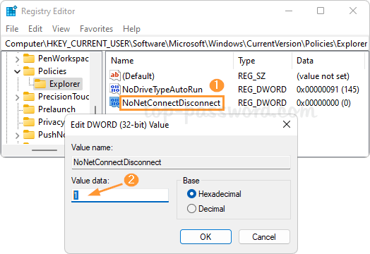 2. Rename the newly-created DWORD to NoNetConnectDisconnect, then double-click it and change its value data to 1.