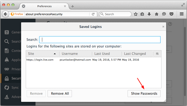 3. Now you will see list of website and username which has been saved in Firefox browser. Passwords are hidden for security reasons, you can click the Show Passwords button to reveal the saved passwords.
