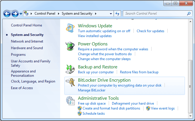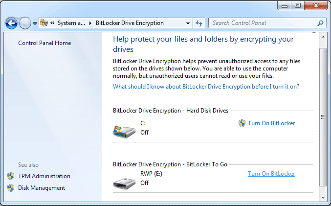Click BitLocker Drive Encryption. This screen presents a list of all the drive partitions and the connected USB drives which could be protected with BitLocker To Go.