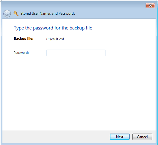 1. Click on the Back up vault link in the Credential Manager. This will bring up the Stored User Names and Passwords wizard.