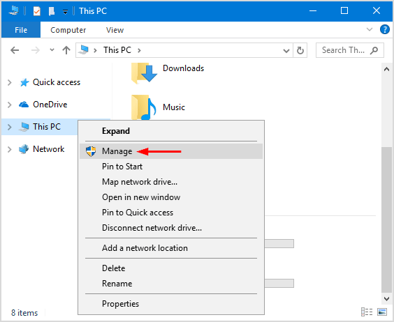 Right-click on My Computer shortcut on your desktop. If you’re running Windows 10, right-click This PC shortcut in the left navigation pane of File Explorer. Next choose Manage from the context menu.