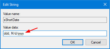 3. In the Edit String window, Add the “ddd, ” string at the beginning of the Value data field and click OK.