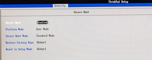 5. Switch to the Security tab, disable the Secure Boot option. Press F10 to save your changes and then reboot.