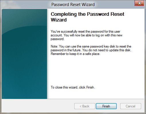 5. Click on Finish. You’ve successfully reset your forgotten Windows 8 password.
