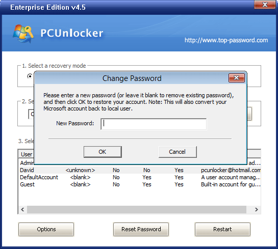 3. When PCUnlocker opens up, you can see a list of local accounts on the screen. Check for your Microsoft online email account under the “Description” column of the list, select that account and click on Reset Password.