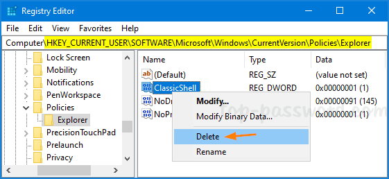 1. Open Registry Editor and navigate to: HKEY_CURRENT_USER\SOFTWARE\Microsoft\Windows\CurrentVersion\Policies\Explorer. In the right pane, locate the DWORD ClassicShell and right-click it, then select Delete from the pop-up menu.