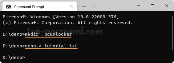 Before getting started, open Command Prompt in the directory where you want to create a folder. You can then use the mkdir command to create a folder starting with a dot. For example, I can create a folder named .pcunlocker by executing this command: