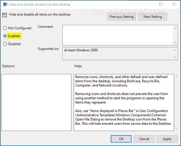 3. After rebooting your PC, all the desktop icons will disappear and you’re unable to right-click on the desktop any longer. If you need to unhide the desktop icons later, just change the group policy setting back to Not Configured.