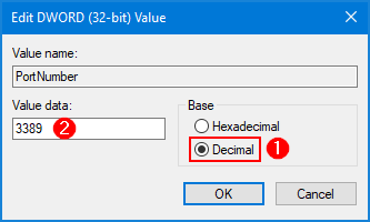 3. Click Decimal, and type in the new port number that you want to use for remote desktop and click OK.