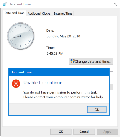 4. Click Apply and then OK. Restart your computer for this policy to take effect. The next time you try to change the date and time from Control Panel, you’ll get the error message “Unable to continue. You do not have permission to perform this task.