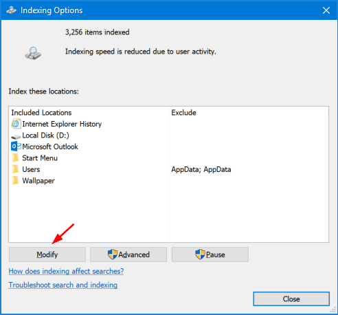 2. The Indexing Options window lists all folders that are included or excluded from indexation. To hide certain files and folders from Windows Search, click the Modify button at the bottom.