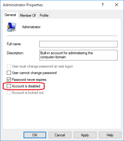 3. In right-side pane double-click on Administrator account. It’ll open its Properties window. Uncheck the “Account is disabled” option.