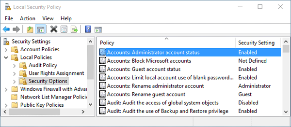 2. When the Local Security Policy window opens, expand Local Policies > Security Options. In right-side pane, double-click on the policy “Accounts: Administrator account status” and set it to Enabled.