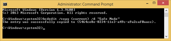 This command clones the current OS boot settings to a new boot entry named “Safe Mode”. Close the Command Prompt after the command above is executed.