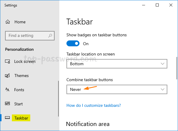 In the Settings window, click the “Combine taskbar buttons” drop-down list and select Never.