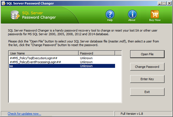 3. Start SQL Server Password Changer. Click on Open File button and select the master.mdf database for your SQL Server instance. In my example, the master.mdf file is located in C:\Program Files\Microsoft SQL Server\MSSQL10.MSSQLSERVER\MSSQL\DATA.
