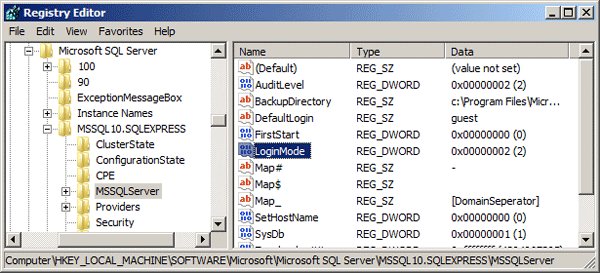 2. Navigate to the registry location: HKEY_LOCAL_MACHINE\SOFTWARE\Microsoft\Microsoft SQL Server\MSSQL10.SQLEXPRESS\MSSQLServer, where MSSQL10.SQLEXPRESS is the name of your SQL Server instance.