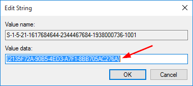 When the Edit String dialog box appears, copy and paste one of the following GUIDs into the Value data box, and then click OK.