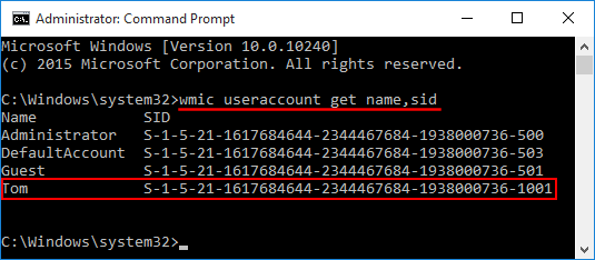 As you can see from above screenshot, the SID for my currently logged-on user ends with 1001.